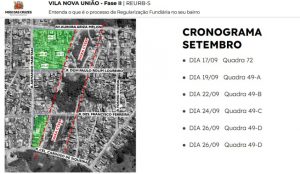 Foi elaborada uma agenda para o cadastro dos moradores da Vila Nova União, de acordo com as quadras onde moram. As datas podem sofrer alterações por condições climáticas: