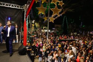 Cerca de 4 mil pessoas lotaram a praça João Pessoa na noite desta sexta-feira (05/12) para acompanhar a aguardada chegada do Papai Noel, que marcou oficialmente a abertura do “Natal da Alegria”, com uma programação especial. Famílias se reuniram para vivenciar um evento repleto de fé, emoção e a tradicional passagem do bom velhinho pelo centro comercial.
