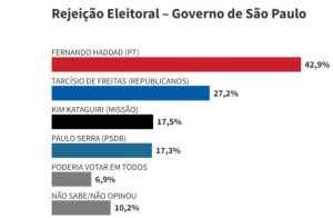 Na sequência, aparece o atual governador Tarcísio de Freitas, com taxa de rejeição de 27,2%. Já o deputado federal Kim Kataguiri e o prefeito de Santo André, Paulo Serra, registram índices próximos, configurando empate técnico: 17,5% e 17,3%, respectivamente.
