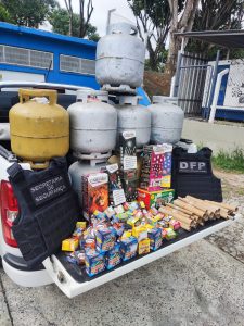 Durante a ação, três estabelecimentos comerciais foram flagrados vendendo fogos de artifício e gás GLP (botijão de 13 kg) sem autorização legal. A operação contou com o apoio da Guarda Civil Municipal, que atuou para garantir a segurança da equipe e o cumprimento das medidas administrativas.